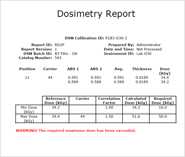 Description: 2 dosimeters/pouch, routine process monitoring dosimetry with reference position information. All fields in the table below are included in this report.